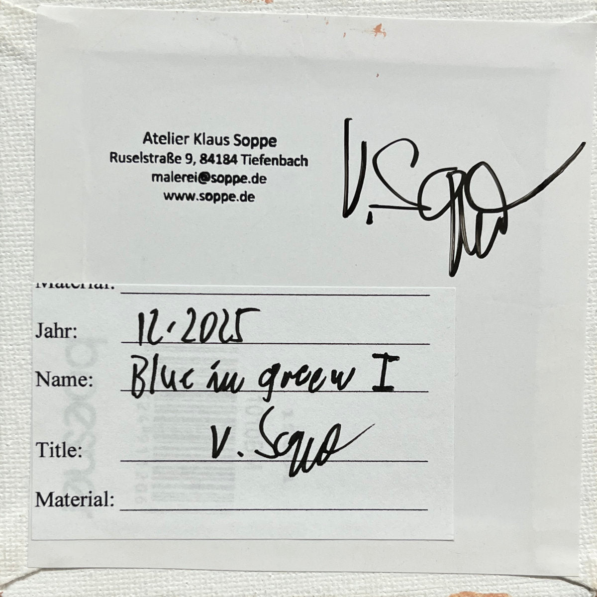 "Blue in green 1", unique painting, hand-painted single piece, 12 x 12 cm, with picture frame