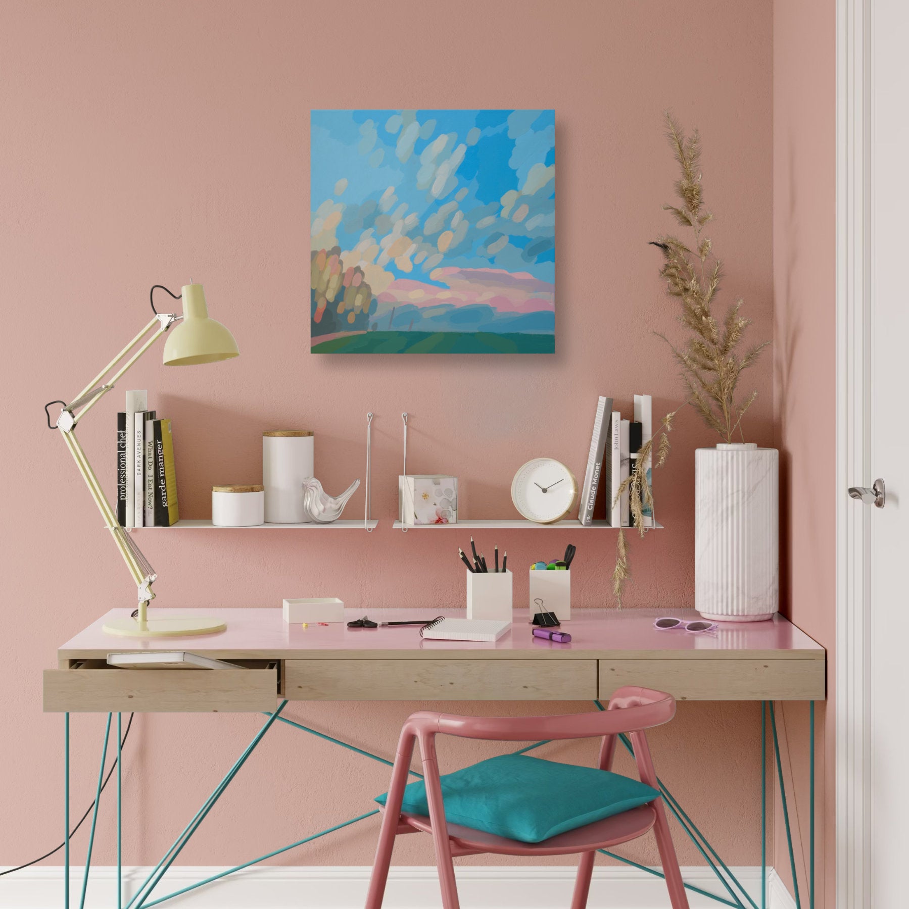 Die stimmungsvolle Originalmalerei zeigt den Blick in einen heiteren Wolkenhimmel über einem weiten Feld. Die sensible Farbwahl verleiht der Malerei starke Leuchtkraft und passt perfekt in jedes moderne und zeitgemäße Ambiente.